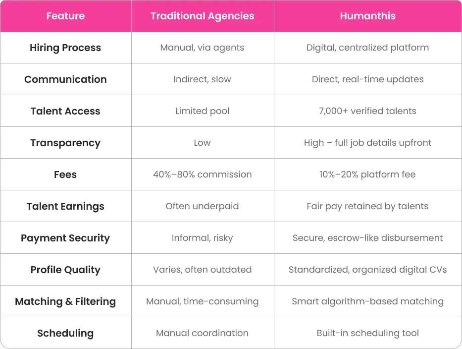 Most agencies take up to 80%, leaving talents underpaid and hirers in the dark. With Humanthis, you get full transparency, fair payouts, and no hidden cuts — just honest hiring that works for everyone.